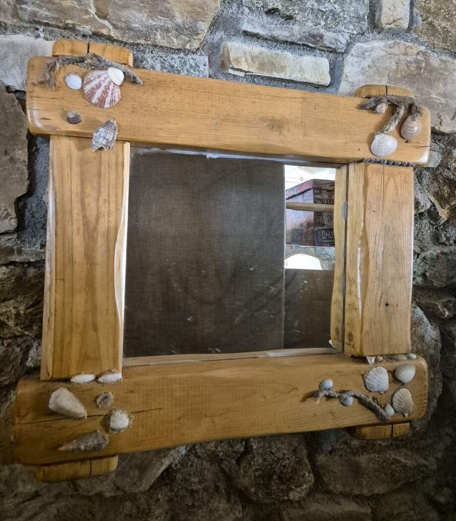 Καθρέπτης τοίχου από ξυλεία καστανιάς διακομισμένο με κοχύλια φυσική απόχρωση.