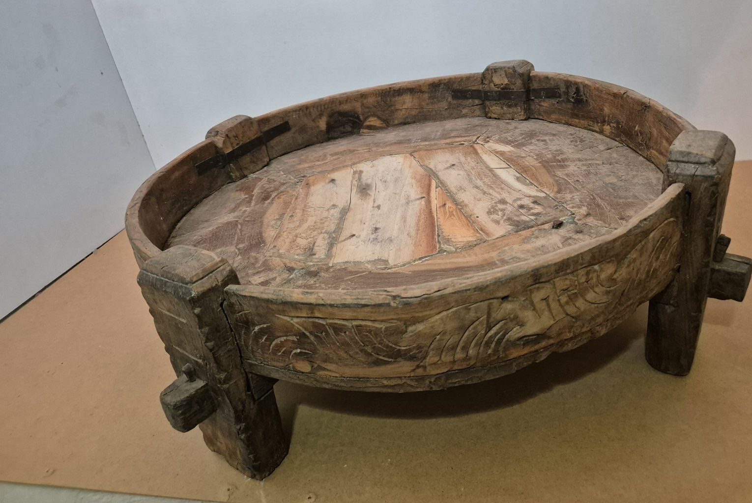 Ιδιαίτερό στρογγυλό ,χαμηλό τραπέζι Grinder άπο ξύλο  τεακ. Η αρχική του χρήση ήταν σαν βάση του χερόμυλου για το άλεσμα σιτηρών η ρυζιού